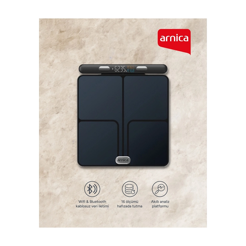 Modern teknolojiyle donatılan Arnica Perfect Bluetooth Baskül EG52250, wifi & bluetooth bağlantısı, yüksek tartma kapasitesi, segmental analiz ve gelişmiş ölçüm özellikleri ile kilo takibini daha akıllı ve detaylı hale getirir. Net dijital göstergesi ve dayanıklı temperli cam yüzeyi sayesinde her tartımda doğru ve güvenilir sonuçlar sunar.