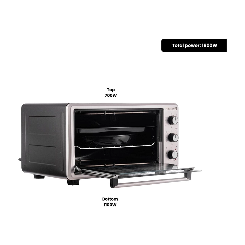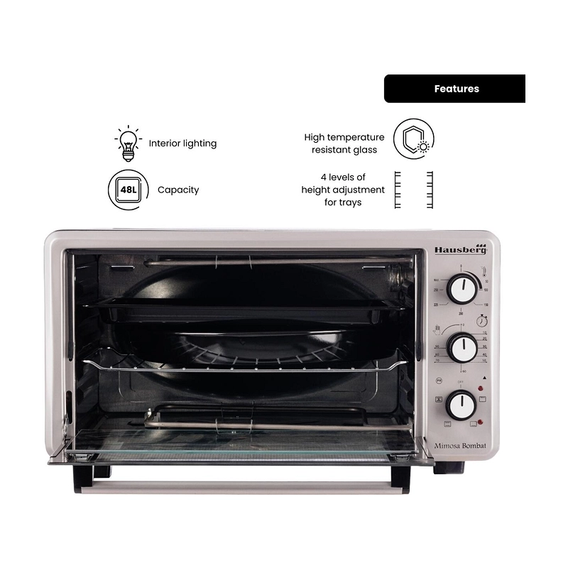 HAUSBERG fanlı elektrikli fırın, yüksek pişirme performansı ve dengeli ısı dağılımı sunan yapısıyla mutfakta çok yönlü kullanım imkânı sağlar. 48 litrelik geniş iç hacmi, aile yemekleri ve çoklu tarifler için ideal alan sunarken fan destekli hava sirkülasyonu, yiyeceklerin her noktasının eşit şekilde pişmesine yardımcı olur. Ayarlanabilir termostat, sıcaklığın 240°C’ye kadar hassas biçimde kontrol edilmesini sağlar.