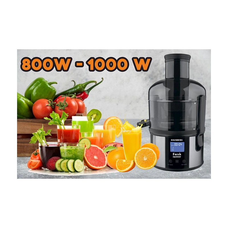HAUSBERG HB 7545 Dijital Katı Meyve Sıkacağı, 800–1000W güçlü DC motoru ve dijital kontrol paneli ile taze, sağlıklı ve vitamin dolu meyve–sebze sularını zahmetsizce hazırlamanızı sağlar. 5 kademeli hız ayarı, 85 mm geniş besleme ağzı ve 1 litrelik posa haznesi sayesinde hem zamandan tasarruf eder hem de kesintisiz kullanım sunar. Şık paslanmaz çelik gövdesi, düşük gürültü seviyesi ve gelişmiş güvenlik sistemiyle günlük kullanım için ideal bir mutfak yardımcısıdır.